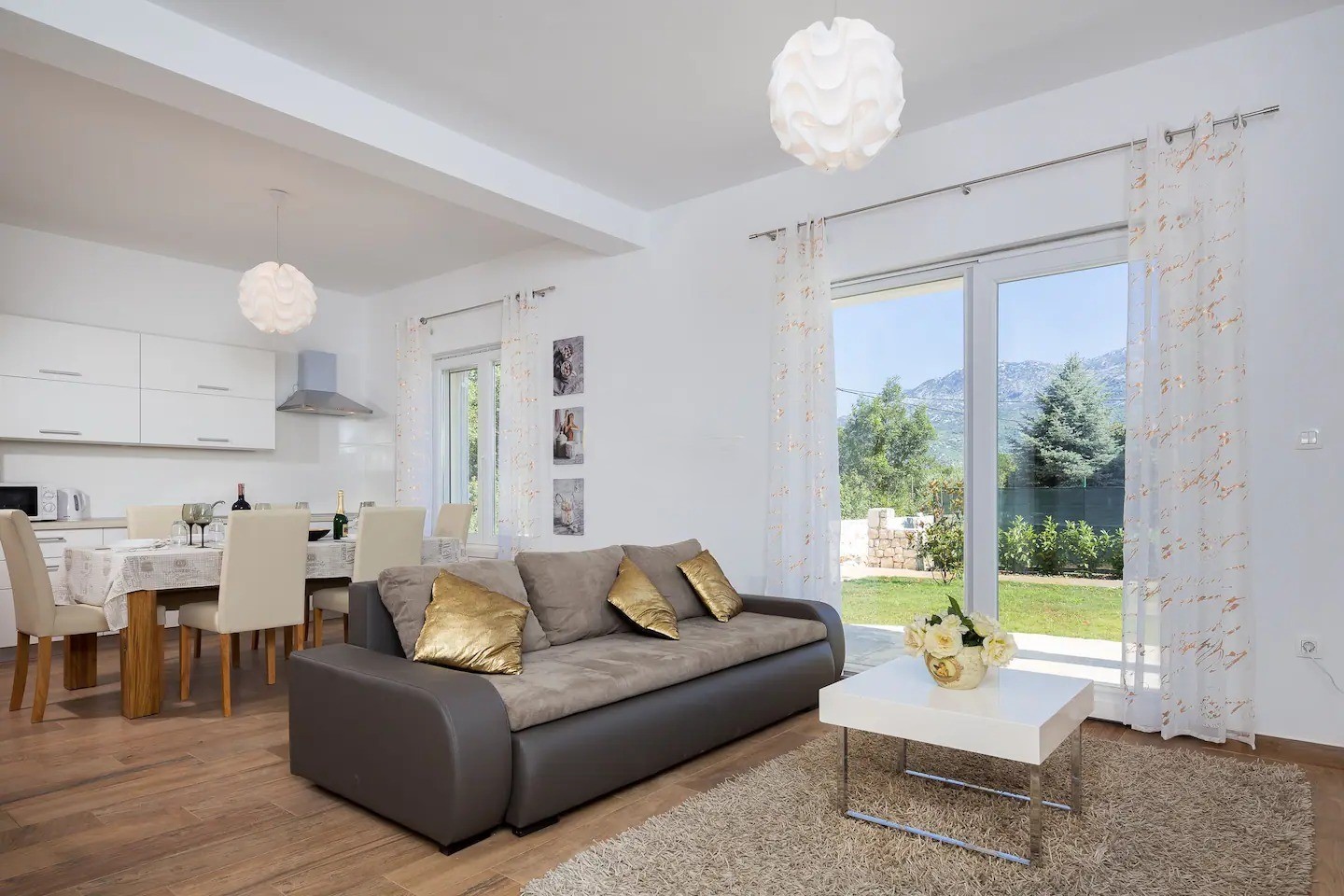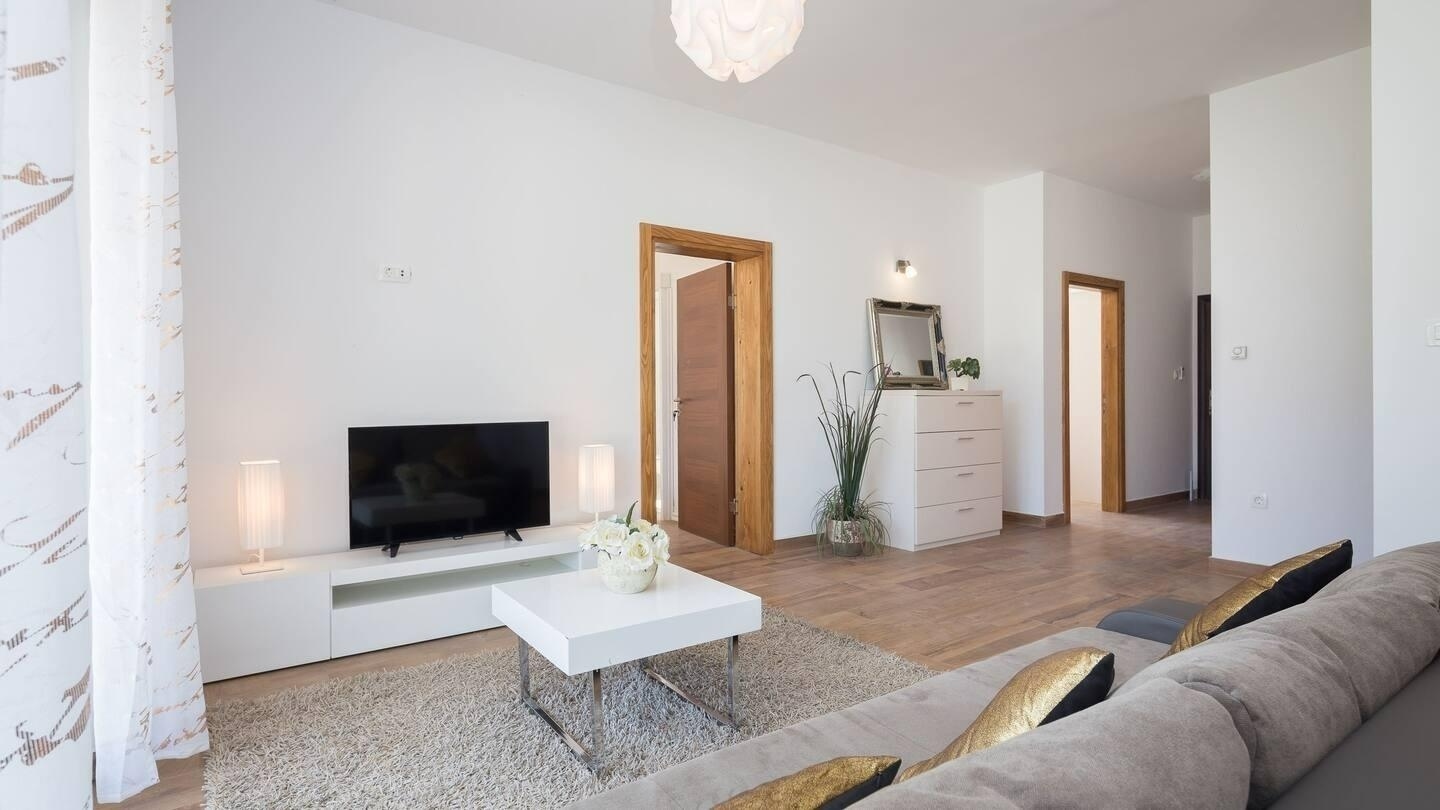 Posredujemo pri najmu četverosobnog stana u Dugopolju. Nalazi se u kući koja se sastoji od dva stana. Sastoji se od četiri spavaće sobe, kuhinje s blagovaonicom i dnevnim boravkom te četiri kupaonice. Stanu pripada na korištenje teniski teren, nogometno igralište, dječje igralište, bazen te vanjska sjenica s roštiljem.