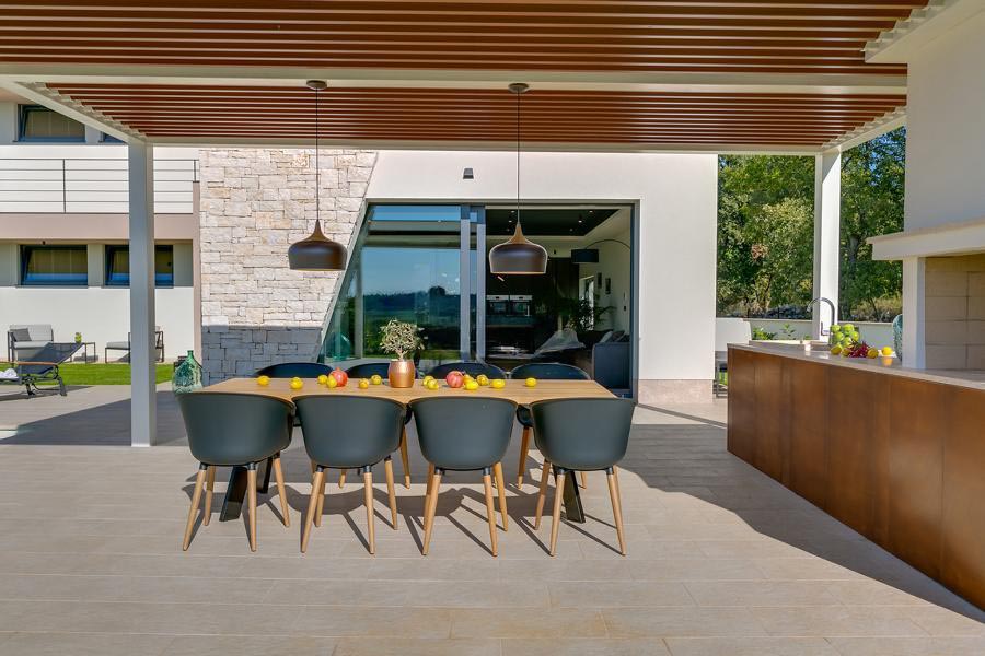 Okućnica ima 946 m2 uređenog prostora, a središnji dio okućnice zauzima infinity bazen površine 60 m2 koji je moderno opremljen s opremom za roštilj