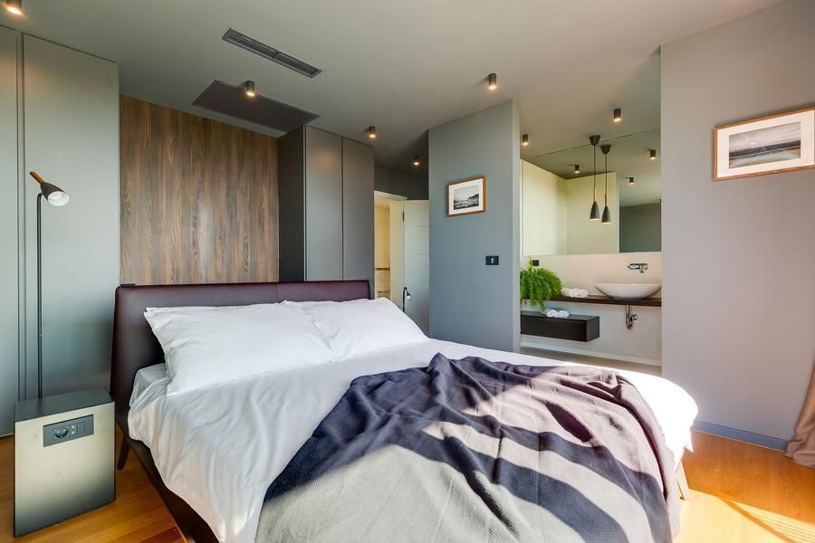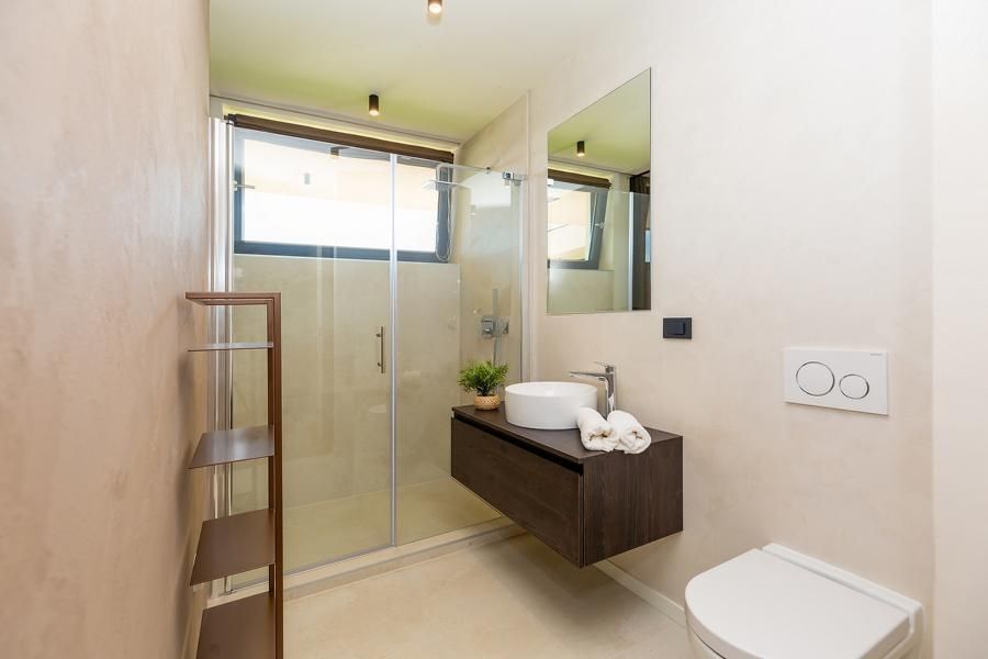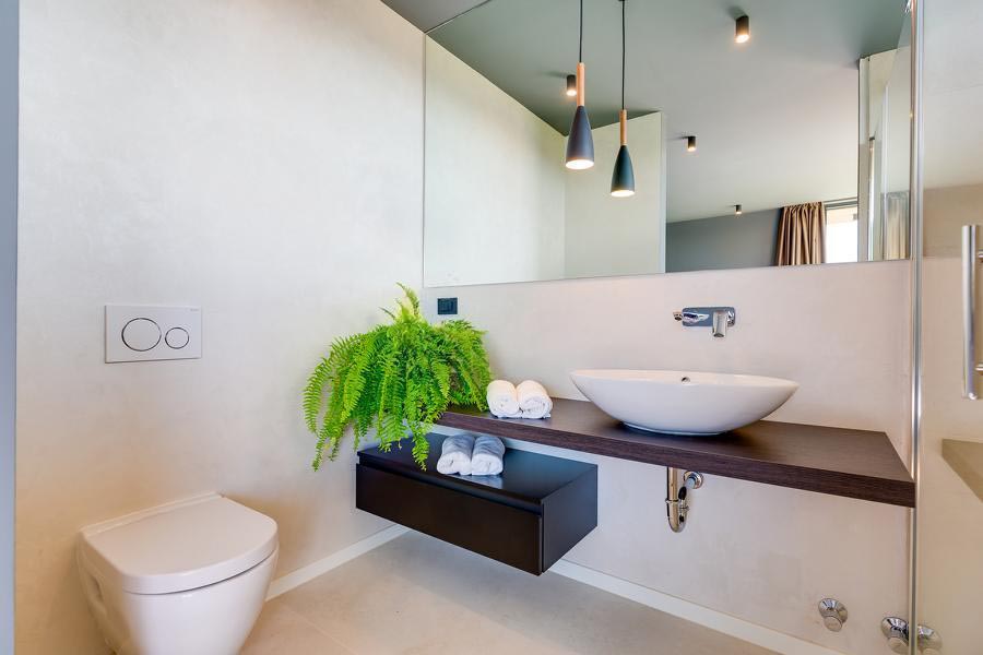 Sanitarije (Hansgrohe) također u modernom stilu s ugradbenim zidnim miješalicama na umivaonike postavljene na konzolni element, viseća WC školjka i tuš prostor izrađeni su sa staklenim pregradnim stijenama.