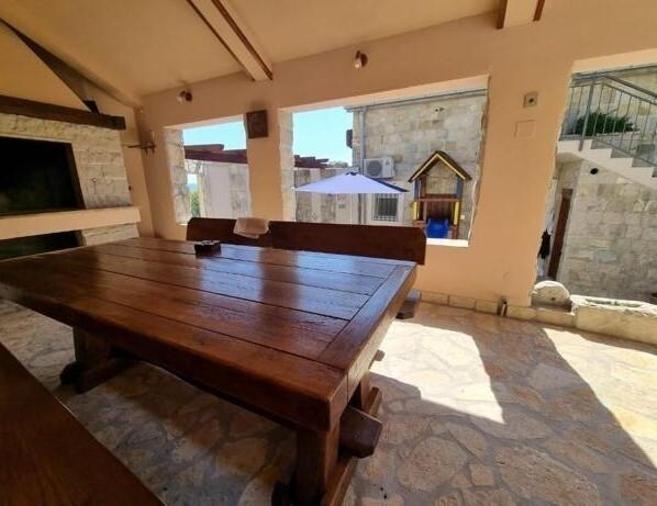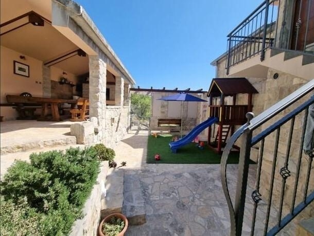 S istočne strane kuće je ograđeno dvorište na kojem se nalazi dječje igralište, ljuljačka, pergola s kaminom te hrastovim stolom za 12 osoba. Na istočnoj strani kuće nalazi se još jedan studio apartman za osoblje s posebnim ulazom. Kuća je potpuno namještena i opremljena prema visokim standardima- blindo vrata, videofon, kovane ograde, centralno grijanje, video nadzor, klimatizacijske jedinice Mitsubishi, kvalitetna izolacija.