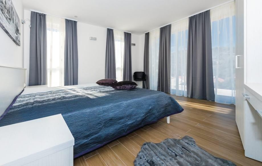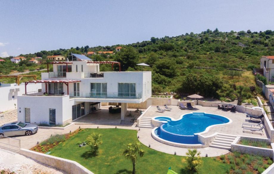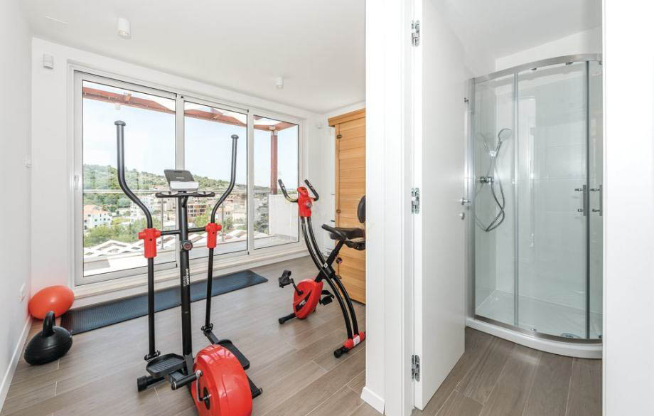 It consists of the ground floor, first and second floors. On the ground floor there is a spacious living room, a kitchen with a dining room and a bathroom. The living room leads to a covered terrace with its own fireplace-barbecue. On the first floor there are three bedrooms with their own bathroom. Each bedroom has access to the terrace and an open view of the sea. On the second floor there is a gym, a jacuzzi and a bathroom. The yard is dominated by a large swimming pool (54m2) in which there is also a whirlpool. It is located in the immediate vicinity of the sea and all necessary facilities.