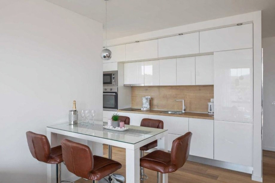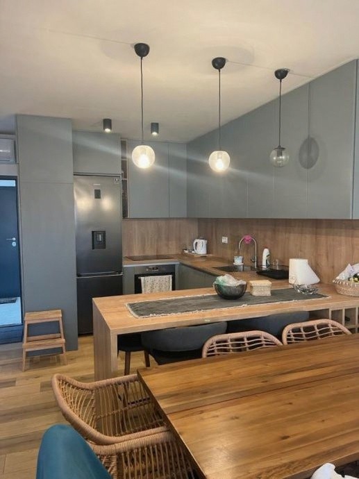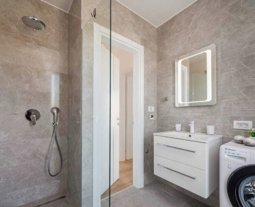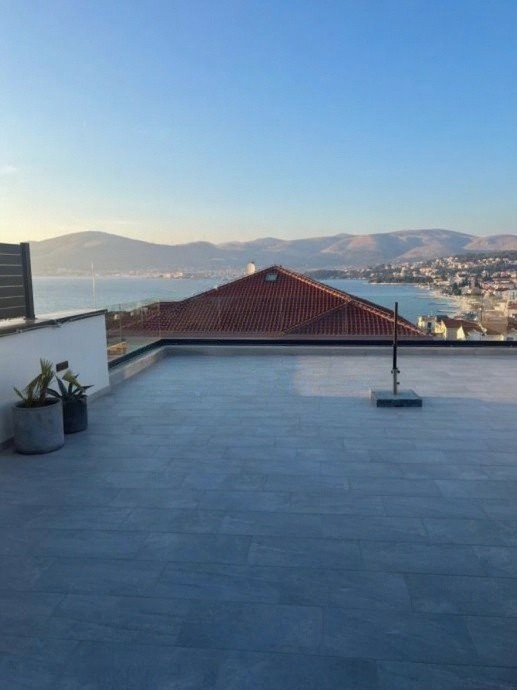 Two-room apartments of 65 m2 are located on the first and second floors, and consist of two bedrooms, a living room, a kitchen with a dining room, a bathroom with underfloor heating, and a terrace. The penthouse has a roof terrace with a jacuzzi, barbecue, deckchairs. There is a beautiful view of the sea from all floors. Distance 200 m from the sea. The building has an outdoor pool and its own parking space.