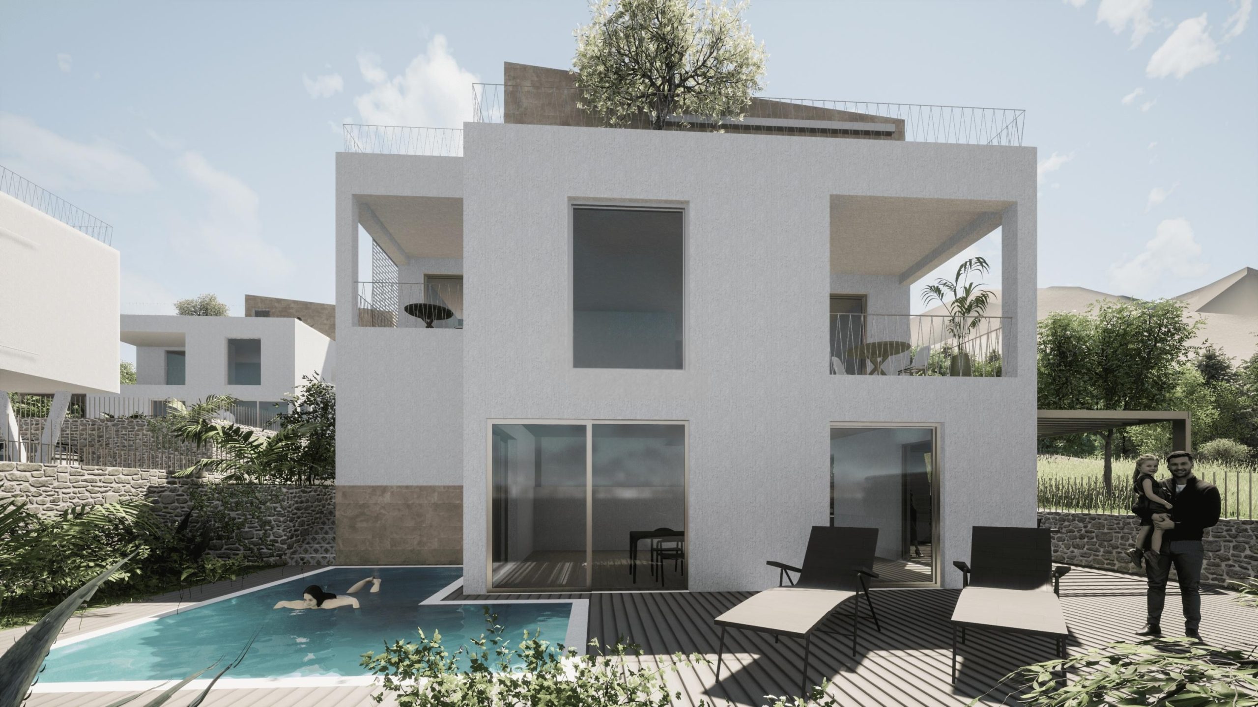 They consist of a ground floor and two floors. On the ground floor there is a hallway, boiler room, bathroom, living room with kitchen and dining room (“open space”) with access to a spacious terrace where there is a swimming pool (20 m2) with an attached sun deck, an outdoor fireplace and a space for enjoyment and relaxation covered by a pergola.