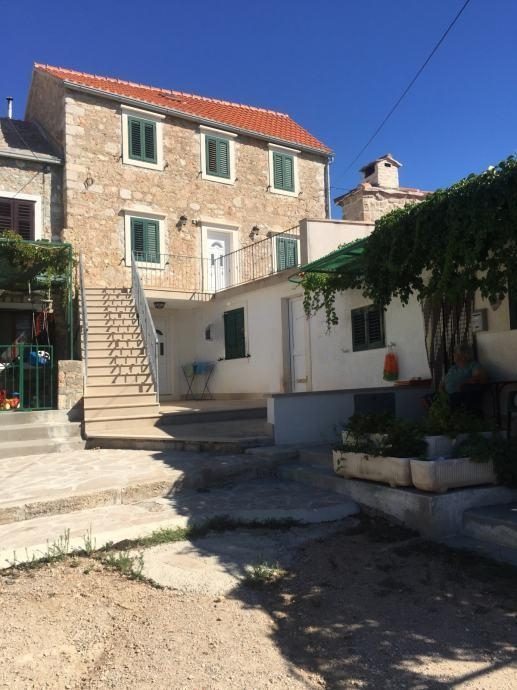 An external staircase leads to the stone house, which extends over two floors. On the first floor (38m2) there is a living room with a kitchen and a dining room, a bathroom and a terrace with a view of the sea and the island of Hvar. On the second floor there are two bedrooms with a sea view. The house also has an attic that can be converted into a living area due to its standing height.