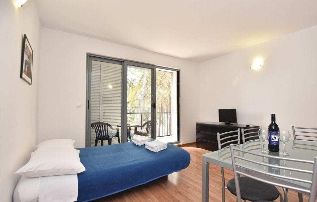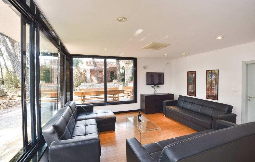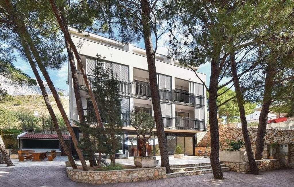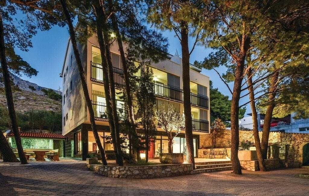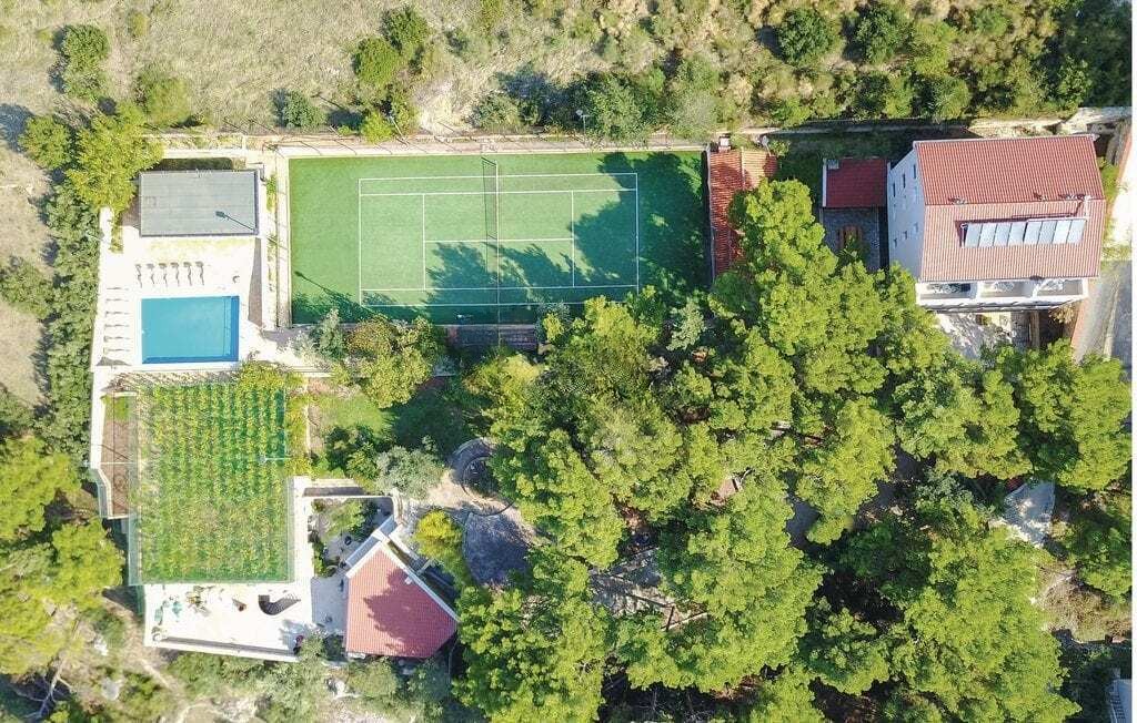This unique property is located on a large land area, where you can find all facilities necessary for the holiday of a larger group of people. The accommodation capacity is situated in the central villa and consists of 9 separate units on three floors, connected by internal stairs and an elevator suitable also for disabled persons. The villa is nicely and functionally furnished. On the ground floor of the central villa, there is nicely fitted out living space and indoor swimming pool. Directly next the central villa, there is a small café-bar with a terrace and a large outdoor barbeque. The spacious swimming pool, from which there is a beautiful panoramic view on the Omis Riviera and kilometre long sandy beaches, is situated next to the tennis ground. Below it, there are four bathrooms. On the property there is also a large space for bocce and a few spacious terraces in the shade of old pine trees. On the fenced and protected property, there is a large underground car park for bigger number of cars